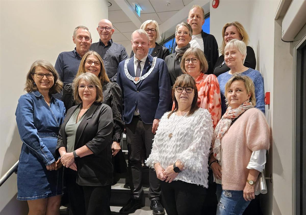 30- og 40-årsjubilanter i 2025 i Namsos kommune. Foran fra venstre: Arnhild Althe, Torunn Fløan Hoås, Elisabeth Olsen Nufsfjord,Hilde Irene Rinnan Broteng. 2. rad fra venstre: Hanne Berit Lingen, ordfører Amund Lein, Åse Fiksdal Kvello, Anne Grethe Strøm. 3. rad fra venstre: Knut Osnes, Aina Peggi Fjeldseth, Marit Elisabeth Haukø. 4. rad fra venstre: Jan Arne Alstad, konstituert kommunedirektør Rønnaug Kirsten Aaring, Tor Eirik Torgersen.